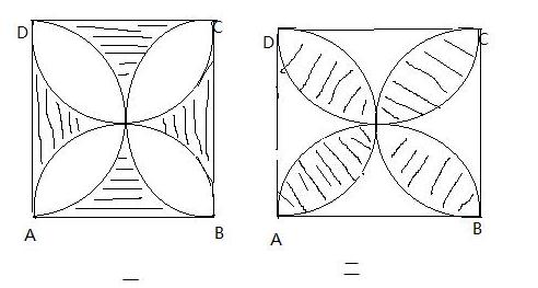 再看第二道题,这道题显然与第一幅图形相同,但所求的面积正好相反。显然可以用做辅助线的方法用刚才的第一种方法求解。也可以这样思考,其实阴影部分的面积是四个半圆整体组成了正方形,但是有重合部分,而重合部分就是所求的阴影部分。这样就可以用四个半圆的面积之和也就是两个圆的面积减去一个正方形的面积。我们知道割补法也是求阴影粉的面积更常用的方法。下面看这样一个问题。