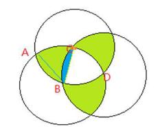 要求黄色部分的面积,显然共三个小部分,先求一个小部分的面积,而不规则图形ABC部分的面积可以将弧AB 形成的小部分的面积割补到弧 BC 那里,从而整个不规则的部分变成了一个小扇形的面积,从而变成要求三个小扇形的面积,由于三角形 ABC 是个等边三角形,所以为六分之 一圆。总共就是二分之一圆。可见割补法能将不规则图形的面积转化为规则图形的面积。可见转化思想是我们求阴影部分面积的主要思想,大家要多总结,才能在考场上在短短的二分钟内对于这样 的几何体应对自如。
