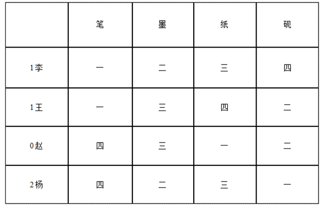【例3】张老师将文房四宝装在一个有四层抽屉的柜子里,让学生猜笔、墨、纸、砚分别在哪一层。按照笔、墨、纸、砚的顺序,小李猜测四宝依次装在第一、二、三、四层,小王猜测四宝依次装在第一、第三、第四和第二层,小赵猜测四宝依次装在第四、第三、第一和第二层,而小杨猜测四宝依次装在第四、第二、第三和第一层。张老师说,小赵一个都没有猜对,小李和小王各猜对了一个,而小杨猜对了两个。