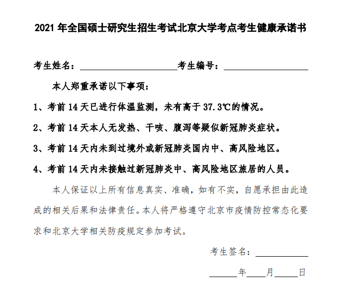 2021 年全国硕士研究生招生考试北京大学考点考生健康承诺书