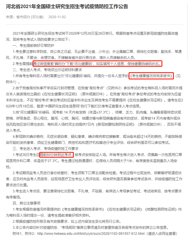 考生需提前通过微信搜索“冀时办”下载“河北健康码”,如实填写个人信息,保持健康码绿码状态。所有考生每科目入场时需要出示“河北健康码”绿码,并提交一份本人签字的《考生健康情况自我承诺书》。所有考生进入考场时,都必须佩戴一次性口罩或医用外科口罩。14 天内有发烧(体温 ≥37.3℃)的,或去过境外或非低风险区的,需要提供 7 日内核酸阴性证明。考试当日考生应提前60分钟到达考点,按考点安排验证入场。所有考生每次进入考点,须佩戴一次性医用口罩或医用外科口罩、体温低于37.3℃。