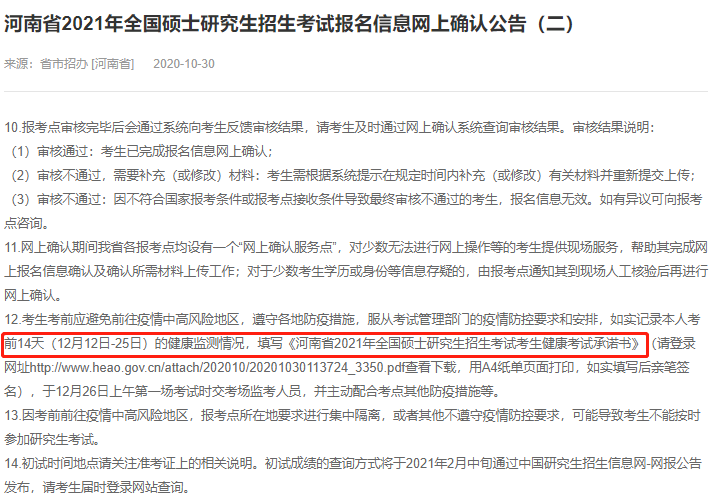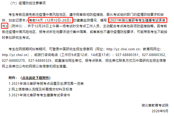考生需如实记录考前14天(12月12日~25日)健康监测情况,签订《健康考试承诺书》,用A4纸打印,于12月26日上午第一场考试时交考场健康人员,并明确说明:因考前前往疫情中高风险地区,报考点所在地要求进行集中隔离,或者其他不遵守疫情防控要求,可能导致考生不能按时参加研究生考试。