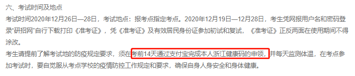 考生请提前了解考试地的防疫规定要求,须在考前14天通过支付宝完成本人浙江健康码的申领,并每天监测体温,在考点参加考试时,要自觉服从考点学校的疫情防控工作规定和要求,确保自身人身安全和身体健康。