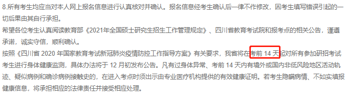 四川省将在考前 14 天起对所有参加研招考试考生进行身体健康监测,具体办法将于12月初发布公告。凡有过身体异常、考前 14 天内有境外或国内非低风险地区活动轨迹、疑似病例和确诊病例接触史的,在进入考点时须出示由专业医疗机构提供的有效健康证明。若考生隐瞒病情、不如实填报健康信息,将承担相应的法律责任并接受相应处理。