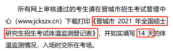 所有网上审核通过的考生请在晋城市招生考试管理中心(www.jckszx.cn)下载打印《晋城市2021年全国硕士研究生招生考试体温监测登记表》,并如实填写14天的体温监测情况,入场时交所在考场。