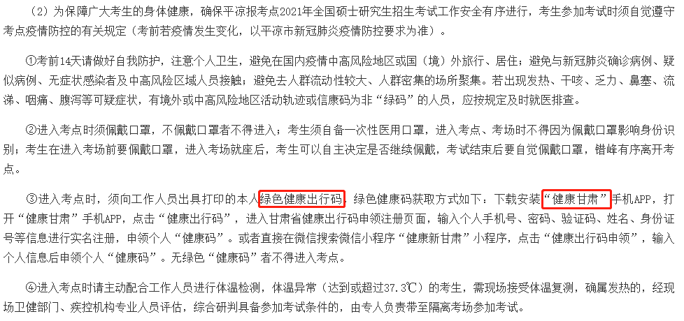 考前14天请做好自我防护,进入考点时须佩戴口罩,不佩戴口罩者不得进入。进入考点时,须向工作人员出具打印的本人绿色健康出行码。