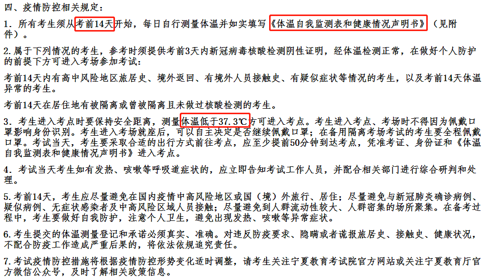 所有考生须从考前14天开始,每日自行测量体温并如实填写《体温自我监测表和健康情况声明书》,考生进入考点时要保持安全距离,测量体温低于37.3℃方可进入考点。