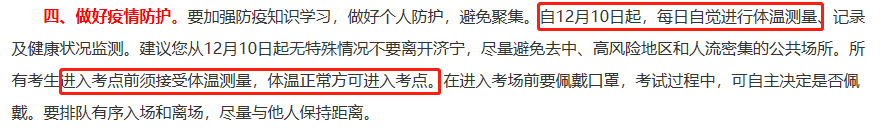 自12月10日起,每日自觉进行体温测量、记录及健康状况监测,所有考生进入考点前须接受体温测量,体温正常方可进入考点。在进入考场前要佩戴口罩,考试过程中,可自主决定是否佩戴。要排队有序入场和离场,尽量与他人保持距离。