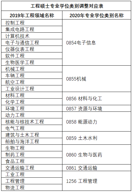 4.工程硕士有经验的学位类别调整:2020年工程硕士有经验的学位招生将原工程领域对应调整为: