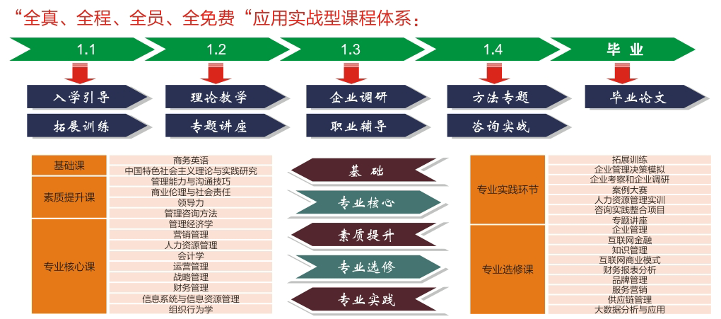 全员实践整合——打造实战型中高层管理人才我校将企业管理咨询“全真、全程、全员、全免费“引入MBA教学培养过程中。该课程分方法专题、咨询实战两个模块,共3个学分。学员在学习管理咨询理论、方法后,在项目指导教师的带领下深入企业,开展为期3个月的企业管理咨询。从项目建议书、项目诊断报告、项目咨询方案到更终验收。均由企业进行严格考评并决定更终项目是否达标。目前已为16家企业进行了17个项目的企业管理咨询。项目得到了企业、学员的一致肯定和高度好评。项目于2014年被评选为中国商学院学子心目中更具潜力的MBA项目。