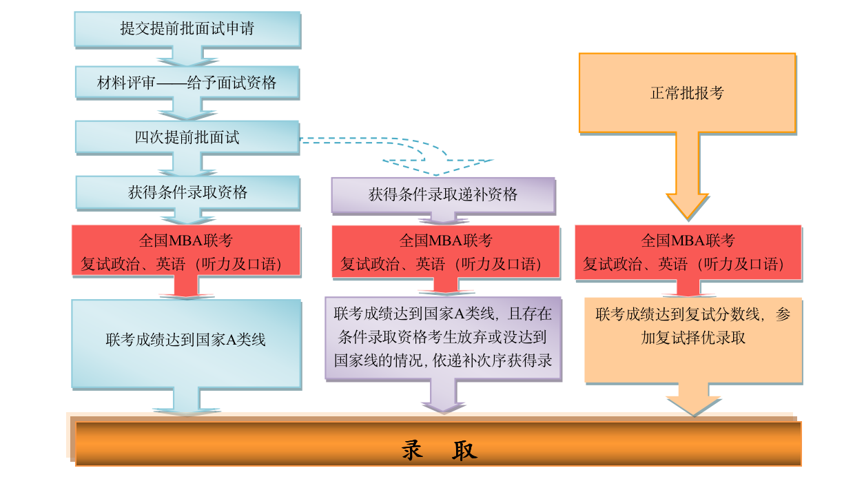 登录中国人民大学商学院MBA项目中心网站“考生服务系统”,按照规定时间提交网上申请材料,学院将组织专家评审申请材料,择优给予提前面试资格并组织面试。面试后获得条件录取资格和条件录取递补资格的考生需参加2020年12月底举行的全国联考。
