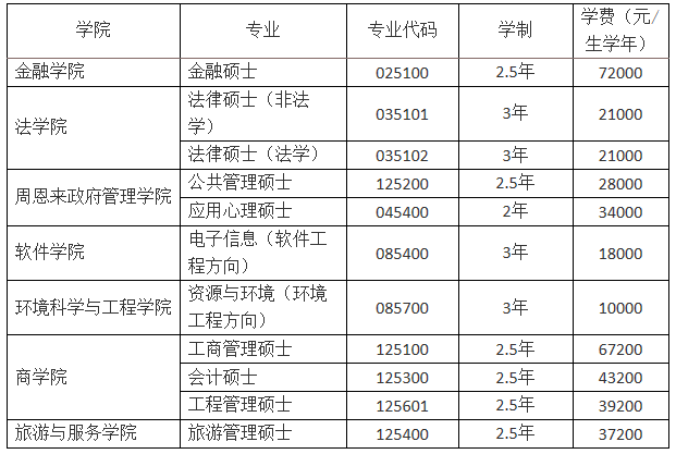 2020年非全日制专业学位硕士研究生招生专业包括:电子信息(软件工程方向)、资源与环境(环境工程方向)、法律(非法学)、法律(法学)、应用心理、公共管理、金融、工商管理、会计、工程管理、旅游管理。