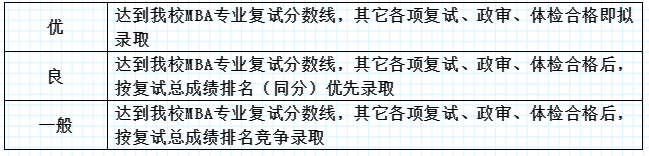 ◆面试结果分为:优、良和一般。优:预面试分数为85分以上且不超过预面试考生比例35%;良:预面试分数70分以上;合格:预面试分数60分以上。MBA拟录取资格对照表如下: