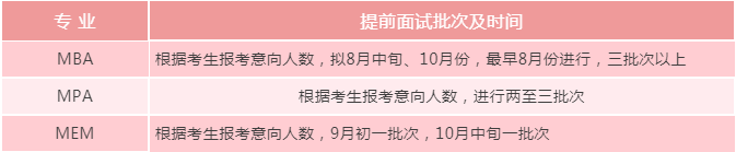 提前面试“预报名”申请截至2020年08月15日(第一批)08月31日(第二批)09月30日(第三批)。以接到管理学院专业学位中心电话确认为准,提前面试名单最终以公示名单为准。