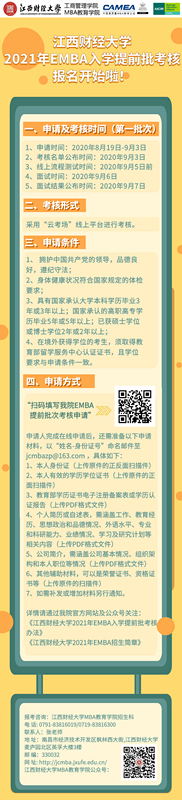 原标题:江西财经大学2021年EMBA入学提前批考核报名开始啦!