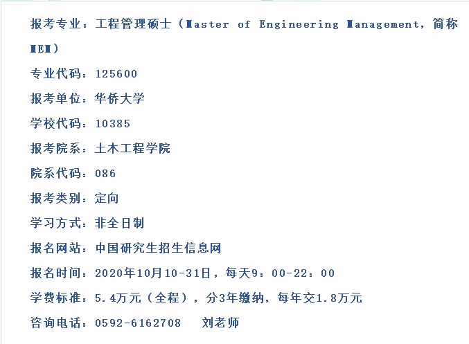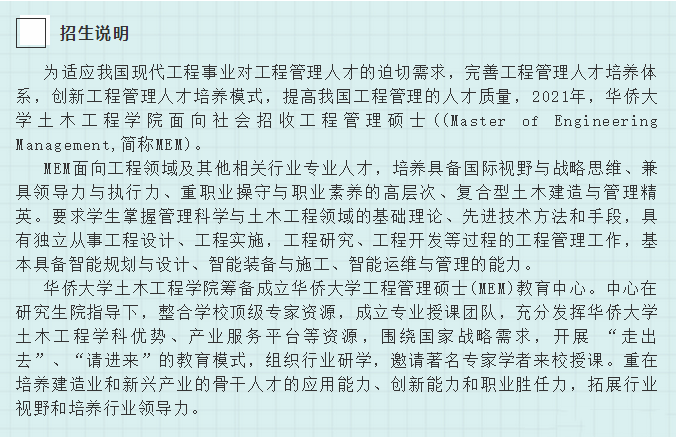 原标题:华侨大学工程管理硕士(MEM)2021招生简章