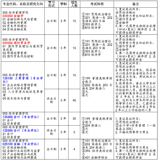 第一志愿报考我校并被录取的金融学、国际贸易学、金融专硕3个专业硕士研究生,每个专业综合成绩(初试成绩+复试成绩)排名前2名,享受经济管理学院全额奖学金。 |